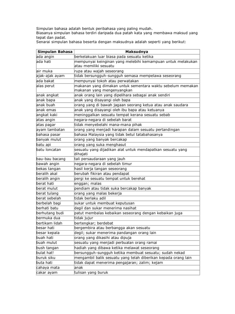 SIMPULAN BAHASA huruf a tanyeetuitionclass_96142. Biasanya Simpulan Bahasa terdiri daripada dua patah kata yang membawa maksud yang tepat dan padat. Upgrade to remove ads.